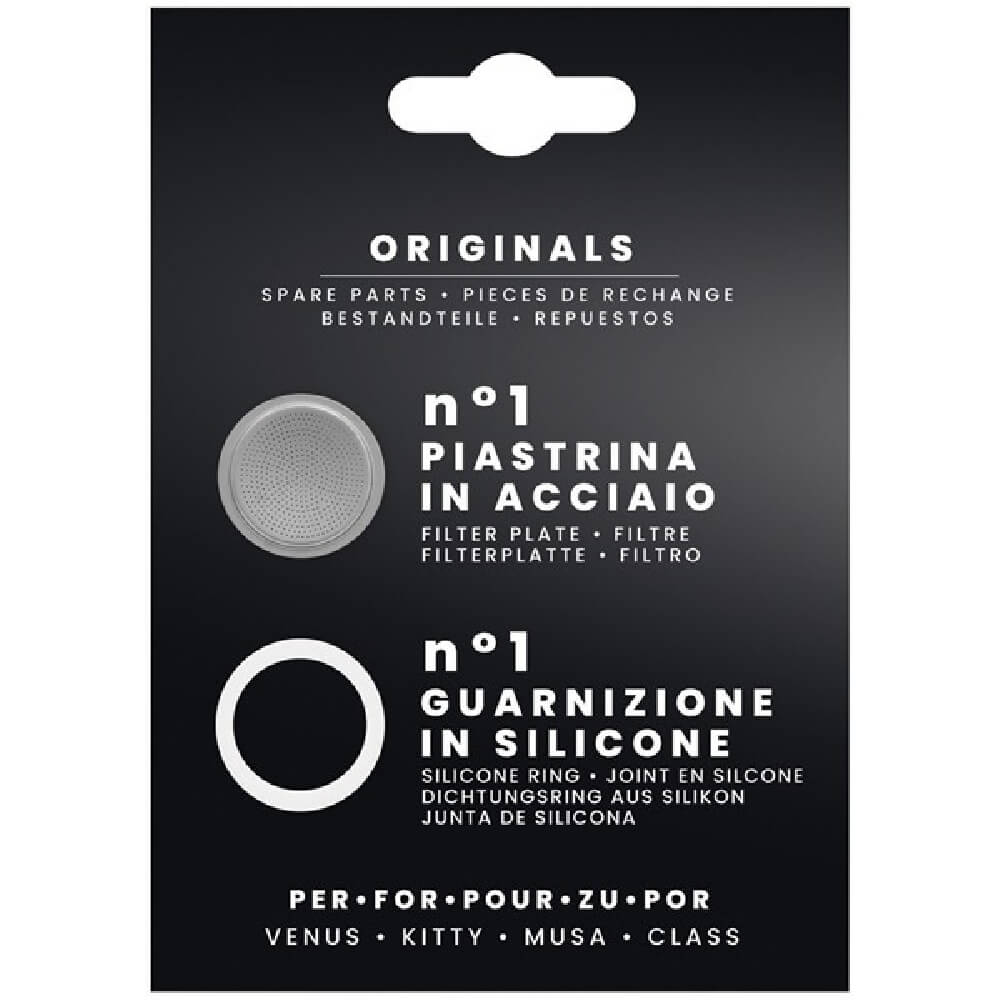 Joint en caoutchouc et tamis en acier inoxydable pour cafetières inox 4 tasses Bialetti. 1 joint en silicone Diamètre extérieur : Ø 64mm / Diamètre intérieur : Ø 50mm / 1 micro-filtre en inox Diamètre filtre : Ø 50mm / Pour cafetières italiennes VÉNUS, KITTY, MUSA et CLASS de la marque BIALETTI.