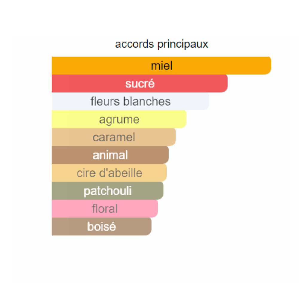 les notes de fond sont Patchouli, Cire d'abeille, Caramel et Réglisse.