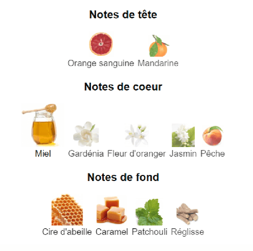 les notes de coeur sont Miel, Gardénia, Jasmin, Fleur d'oranger et Pêche